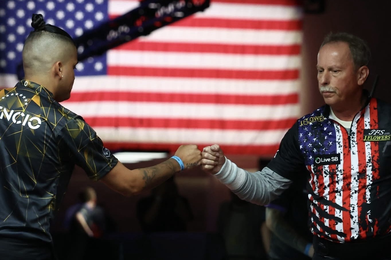 Atencio jumped over the eight ball to hit the six ball in the fourth rack, fluking a hook in the process, with Strickland jokingly saying ‘you’re a lucky guy, I’ll tell you that’ and ‘he thinks he’s good’ as he returned to the table.